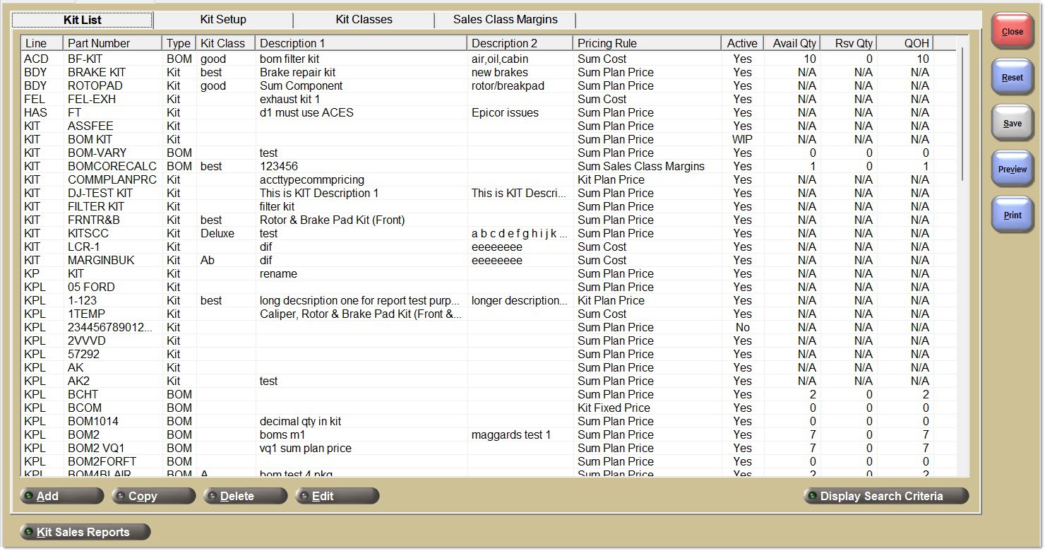 The Kit List Tab is used to display a list of all kits created with buttons to Add, Copy, Delete, or Edit a kit. There is an additional "toggle" button to 'Display Search Criteria' or 'Hide Search Criteria' used for searching kits. When the Kit List tab is opened or the 'Reset' button is clicked, all kits are re-sorted by 'Line' and 'Part Number'. Click on any column heading in the list to re-sort by the desired column.