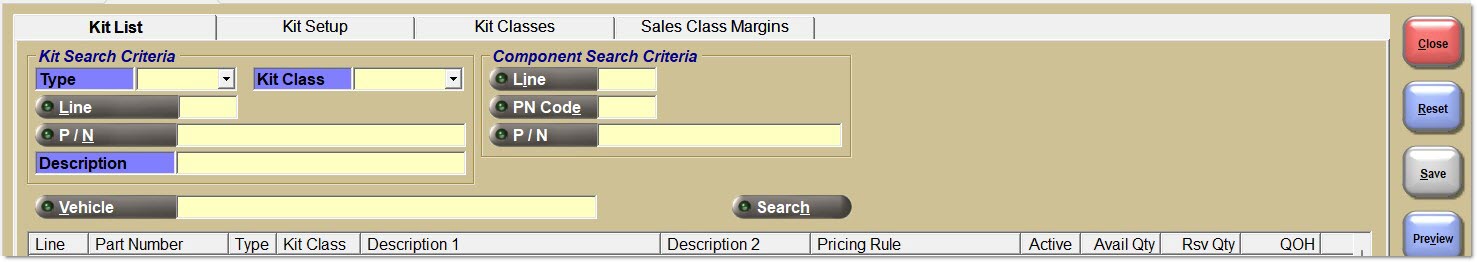 - 'Component Line, PN Code and P/N' - These fields allow the finding of kits that contain parts using the entered 'Line', 'PN Code', or 'P/N'. The fields will perform "beginning text match" searches.