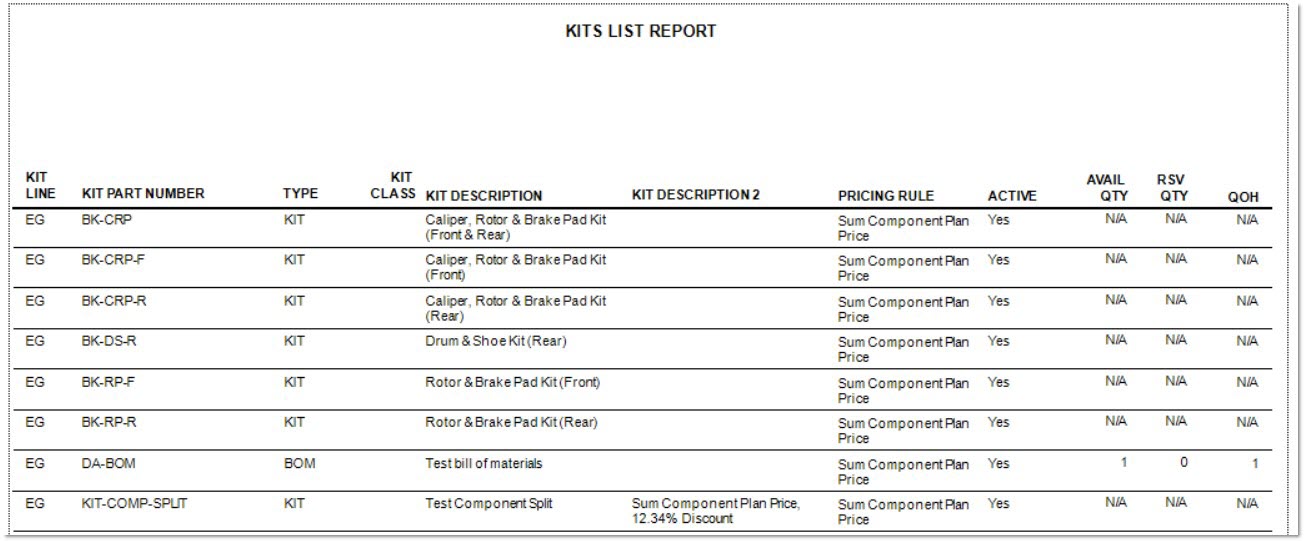 The Kits List Report contains one row for each kit with the same columns that display on the 'Kit List' tab: 'Kit Line', 'Kit Part Number', 'Type', 'Kit Class', 'Kit Description 1', 'Kit Description 2', 'Pricing Rule, 'Active' (status), 'Avail Qty', 'Rsv Qty', and 'QOH'.