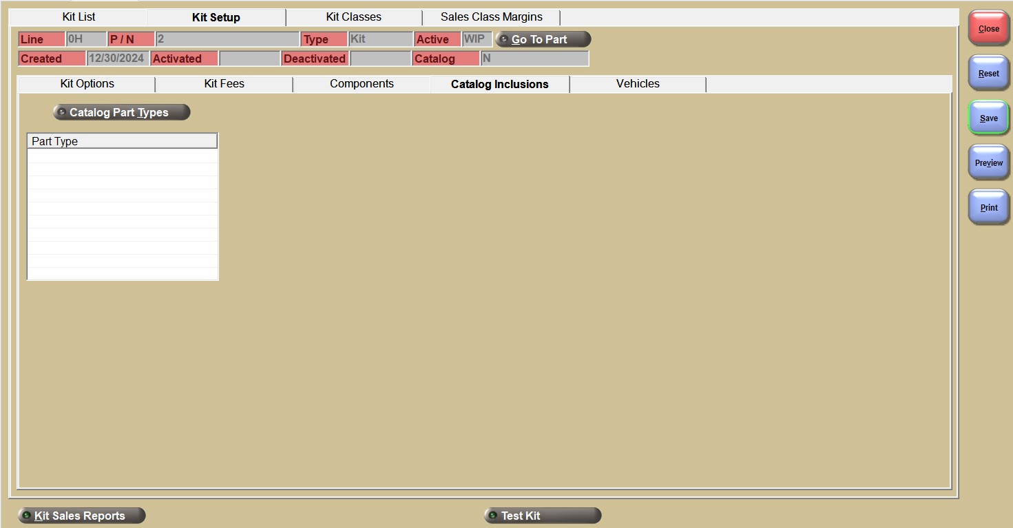 Control if you want your available created KITs to be displayed with a 'Sell' button at the top of the catalog part result set in a section called 'Related Kits' on the CATALOG screen (if using the ACES, Epicor, or TecAlliance Catalogs) when a search of specific 'Part Types' for any vehicle is selected.