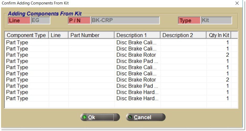 Enter only at least one 'Line' and 'P/N', along with a 'Qty in Kit' value for a 'Component Type' of 'Part List'.
