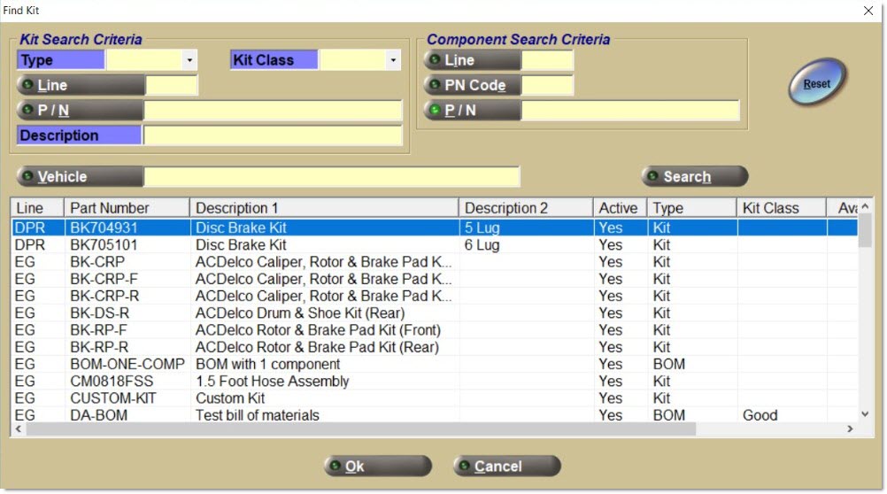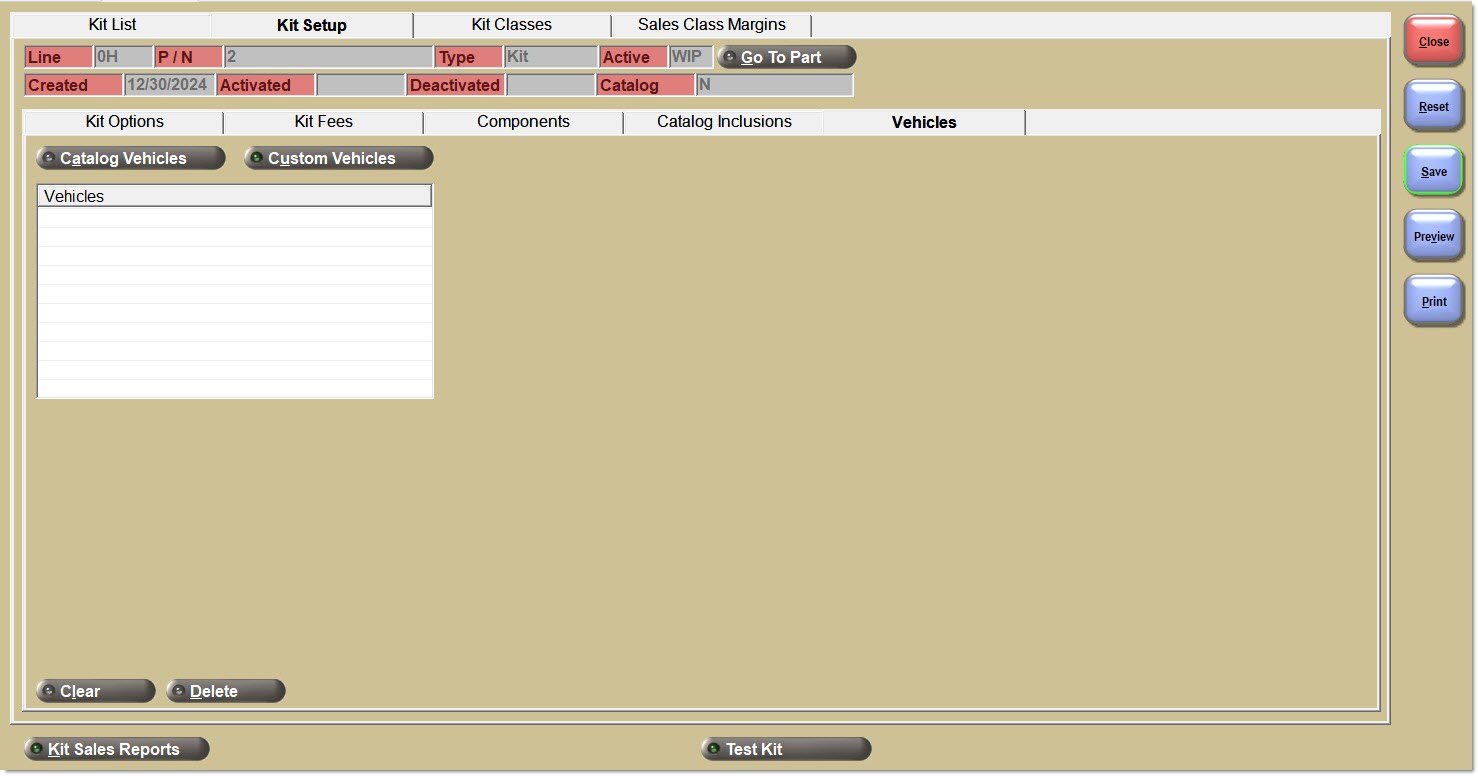 Note: The system cannot compare the custom vehicles setup on this tab with vehicles searched for on the CATALOG screen. However, these custom vehicles can be used on the 'Find Kit' pop-up at Point-of-Sale.