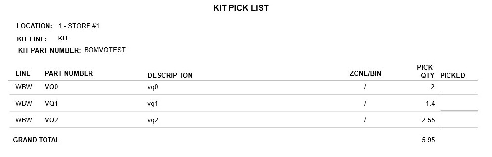 Note: The 'PICK QTY' on the report is the total number of units required for each component to assemble the total number of BOM parts being "packaged". In the example above, two BOM parts are being "packaged" as there are five units required for Component 1 and one unit required for Component 2 to assemble one BOM; so the report displays ten and two respectively.