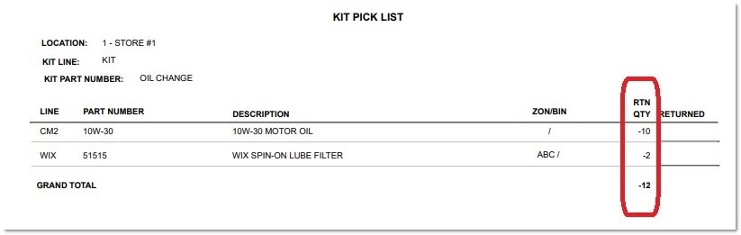In the detail section of the report: (component) 'LINE', 'PART NUMBER', 'DESCRIPTION', 'ZONE/BIN', 'RTN QTY' (with negative values), and 'RETURNED'.