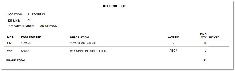 In the detail section of the report: (component) 'LINE', 'PART NUMBER', 'DESCRIPTION', 'ZONE/BIN', 'PICK QTY', and 'PICKED'.