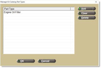 Opens the 'Manage Kit Catalog Part Types' pop-up so that it is possible to 'Add', 'Clear', and 'Delete' 'Part Types' from the grid on the 'Catalog Inclusions' tab.
