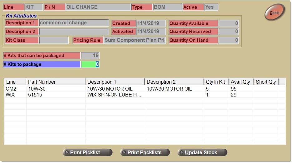 After the picklist prints (to the default assigned printer), the application returns control to the 'Package Kit' pop-up.