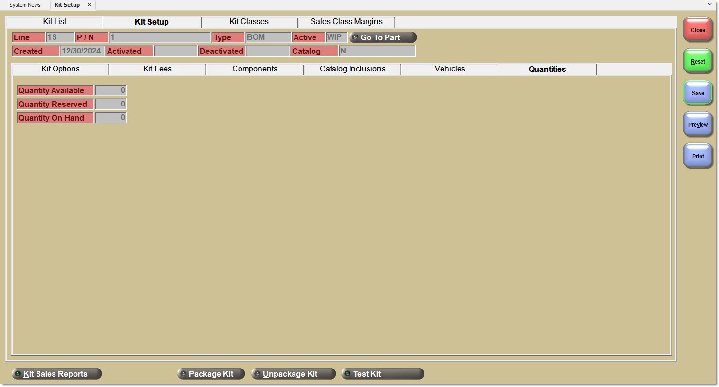 The following view-only information is displayed: 'Line', 'P/N', 'Type', 'Active', 'Description 1', 'Description 2', 'Kit Class', 'Created' (date), 'Activated' (date), 'Pricing Rule', 'Quantity Available', 'Quantity Reserved', and 'Quantity On Hand'.