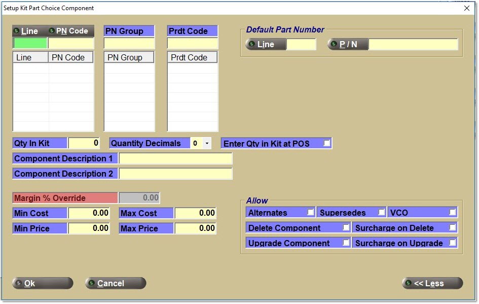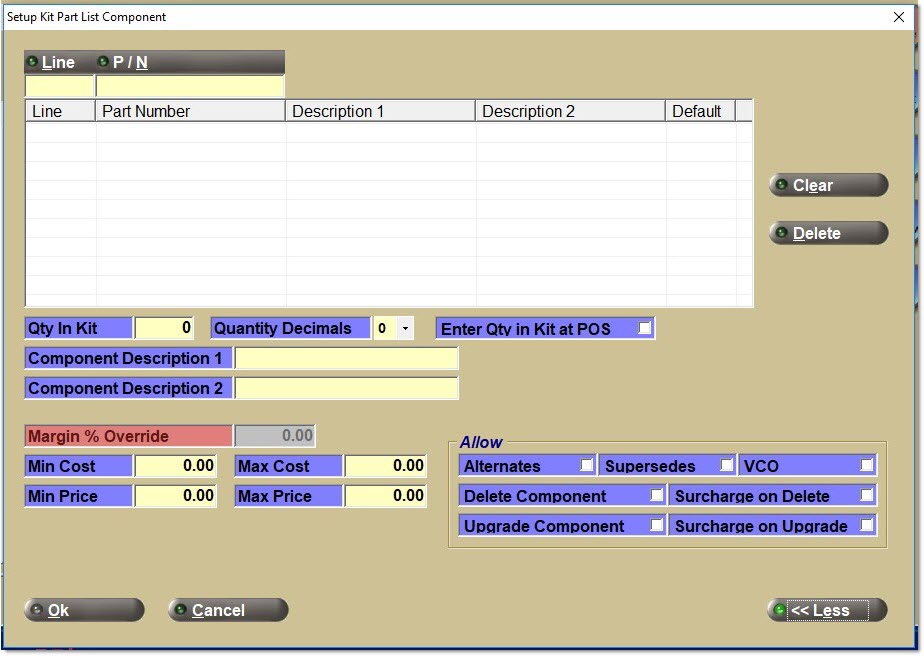 When the 'More >>' button is clicked, the application displays the same additional attributes that are editable for a 'Component Type' of 'Part List'. They are 'Quantity Decimals', 'Enter Qty in Kit at POS', 'Component Description 2', 'Margin % Override', 'Min Cost', 'Max Cost', 'Min Price', 'Max Price', 'Allow Alternates', 'Allow Supersedes', 'Allow VCO', 'Allow Delete Component', 'Allow Surcharge on Delete', 'Allow Upgrade Component', and 'Allow Surcharge on Upgrade'.
