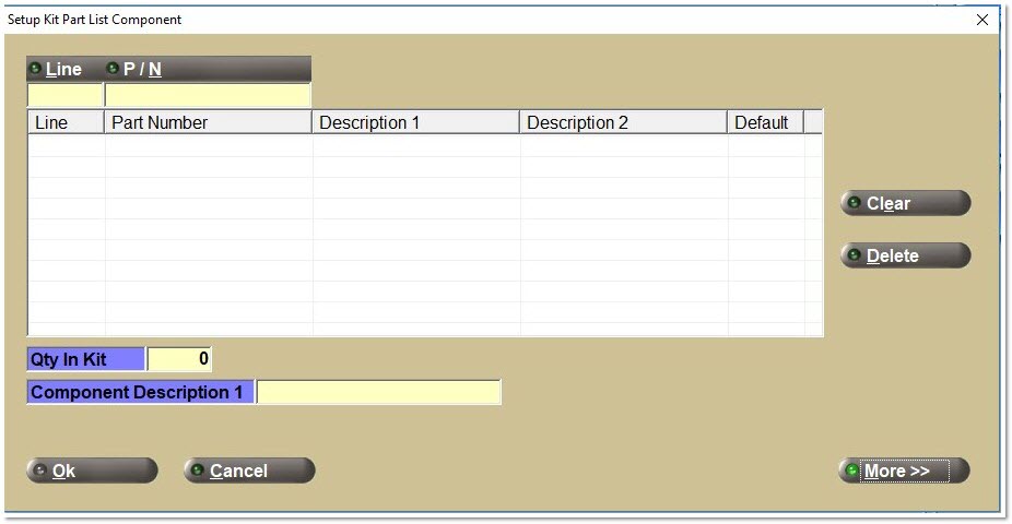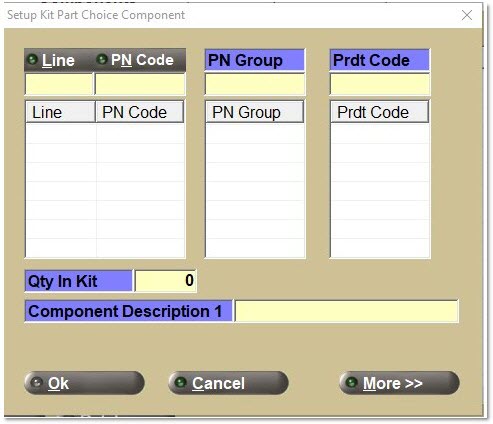 When the pop-up opens, the 'Cancel' and 'More >>' buttons are enabled but the OK button is only enabled after at least one part in the list is entered and a has a 'Qty in Kit' value (used for all parts in the list).
