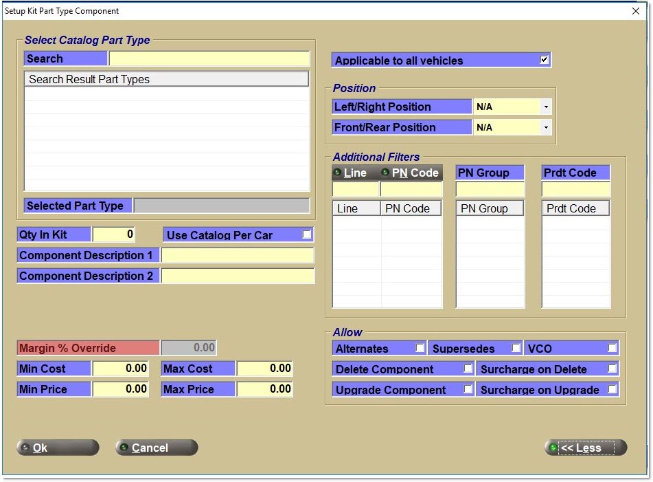 The next filter, 'Applicable to all vehicles' (default checked), can be used for a kit with multiple 'Part Types' where some components are only applicable on certain vehicles and other components apply to all vehicles. -