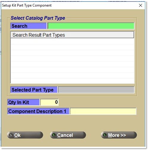 When the pop-up opens, the 'Cancel' and 'More >>' buttons are enabled, but the 'OK' button is only enabled after a 'Selected Part Type', 'Qty in Kit', and 'Component Description 1' are entered.