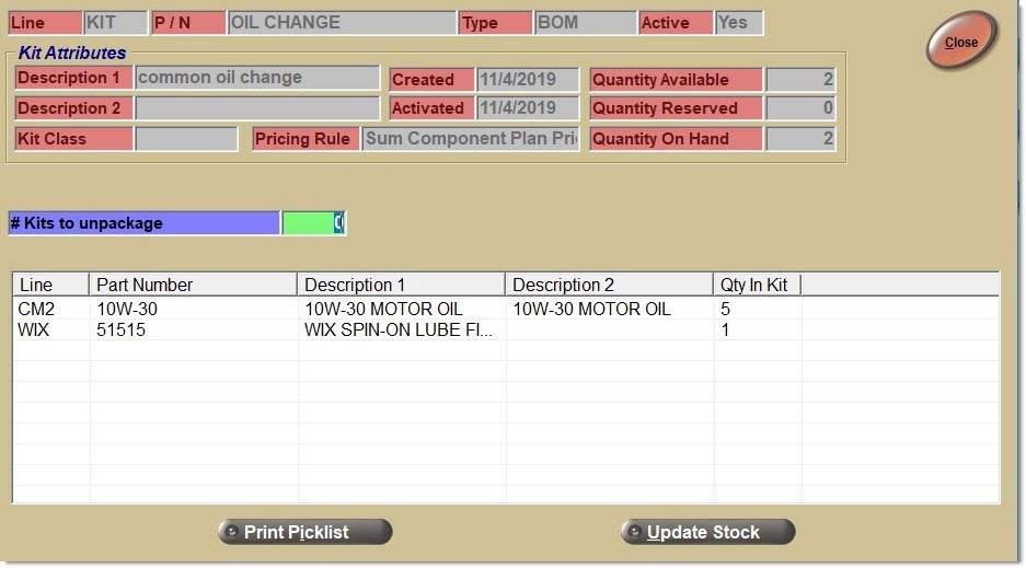 After the picklist prints (to the default assigned printer), the application returns control to the 'Unpackage Kit' pop-up.