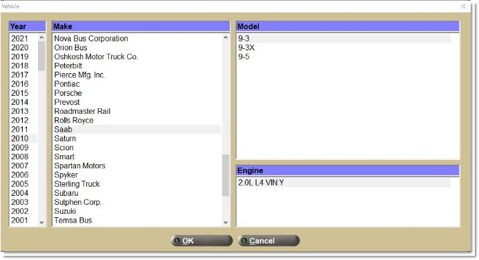Opens the Vehicle pop-up so that it is possible to select and add catalog structured vehicles (with 'Year', 'Make', 'Model', and 'Engine' pre-filled) to the list.