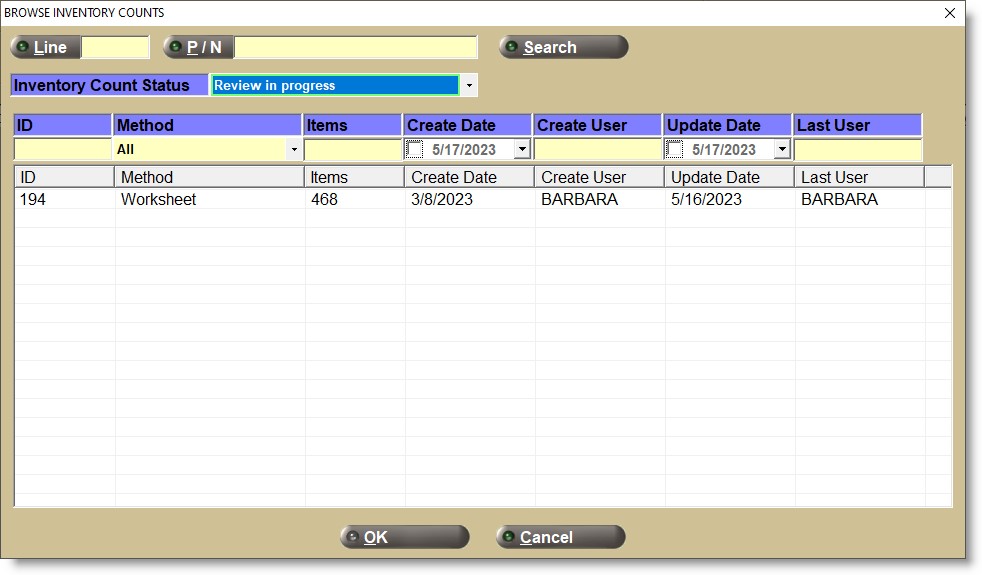 To search for a count ID and narrow the results in the grid, enter a Line in the 'Line Code' field or click the 'Line Code' button to open the 'BROWSE LINE CODES' window to select a line code and/or enter a part in the 'P/N' field or click the 'P/N' button to open the 'FIND PART' window to select a part number, and click the 'SEARCH' button to display the results.