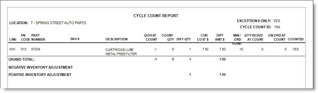 For example, if a cycle count was performed last night and the physical scanned inventory was 9 for a part on the shelf. This amount was 1 less than the part's 'QOH' of 10 in the store's inventory file (based upon a "snapshot" copy of the part's 'QOH' taken at the time the part was scanned in the cycle count session).