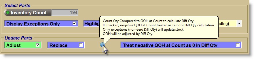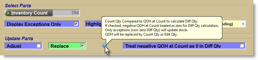 Note: When the 'Replace' checkbox is checked, the 'Treat negative QAVL at Count ' checkbox, whether checked or unchecked, only affects the calculation of 'Diff Qty', which determines the number of exception parts to be updated.