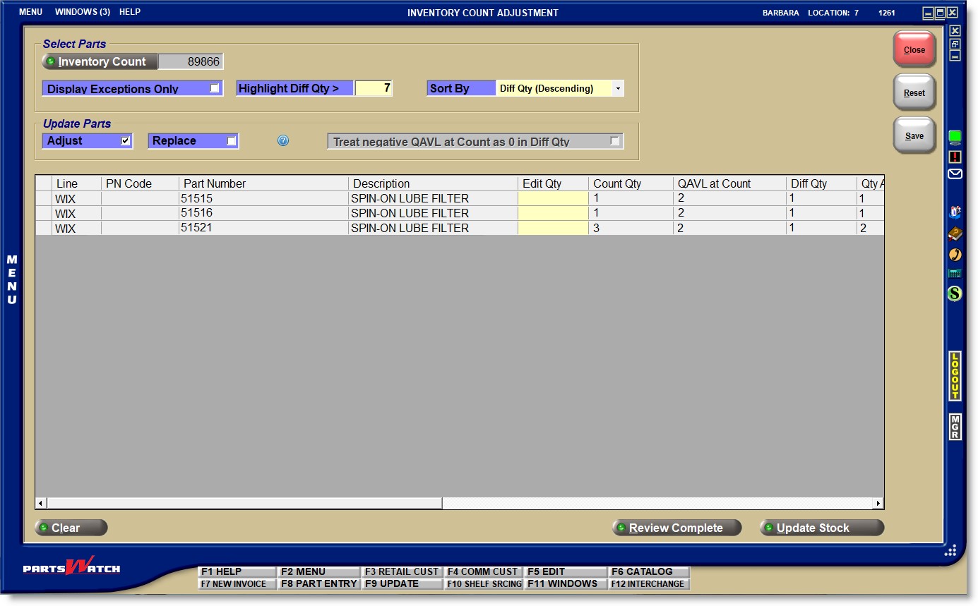 Note: Parts with a zero 'Diff Qty' will not update the part's current 'Qty Avail' in the store’s inventory file.