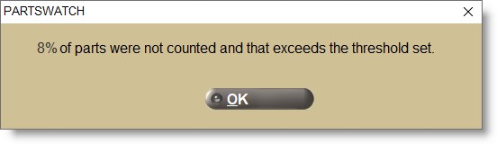 - When the Inventory Count Adjustment screen is opened, after selecting an inventory count ID and parts are loaded into the grid, a pop-up message displays if the percentage of parts "not counted" exceeds the threshold.