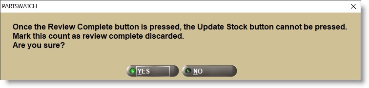 If there are any parts with non-zero 'Diff Qty' values, "Once the Review Complete button is pressed, the Update Stock button cannot be clicked. Mark this count as review complete discarded. Are you sure?" Answer: