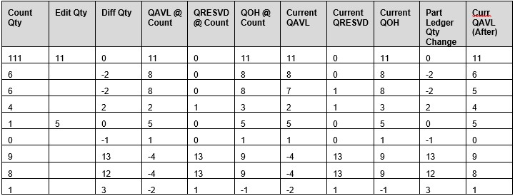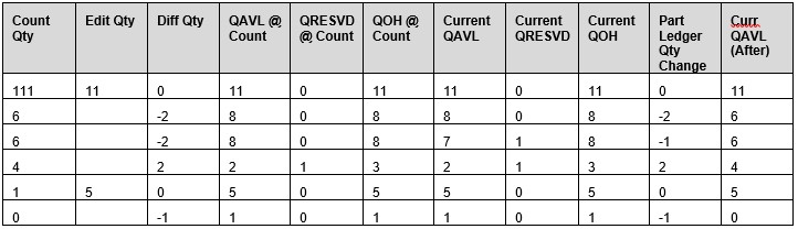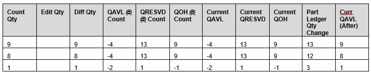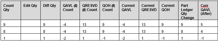 - 'Diff Qty' = 'Count Qty' - 'QAVL at Count' (if 'Edit Qty' is blank)
