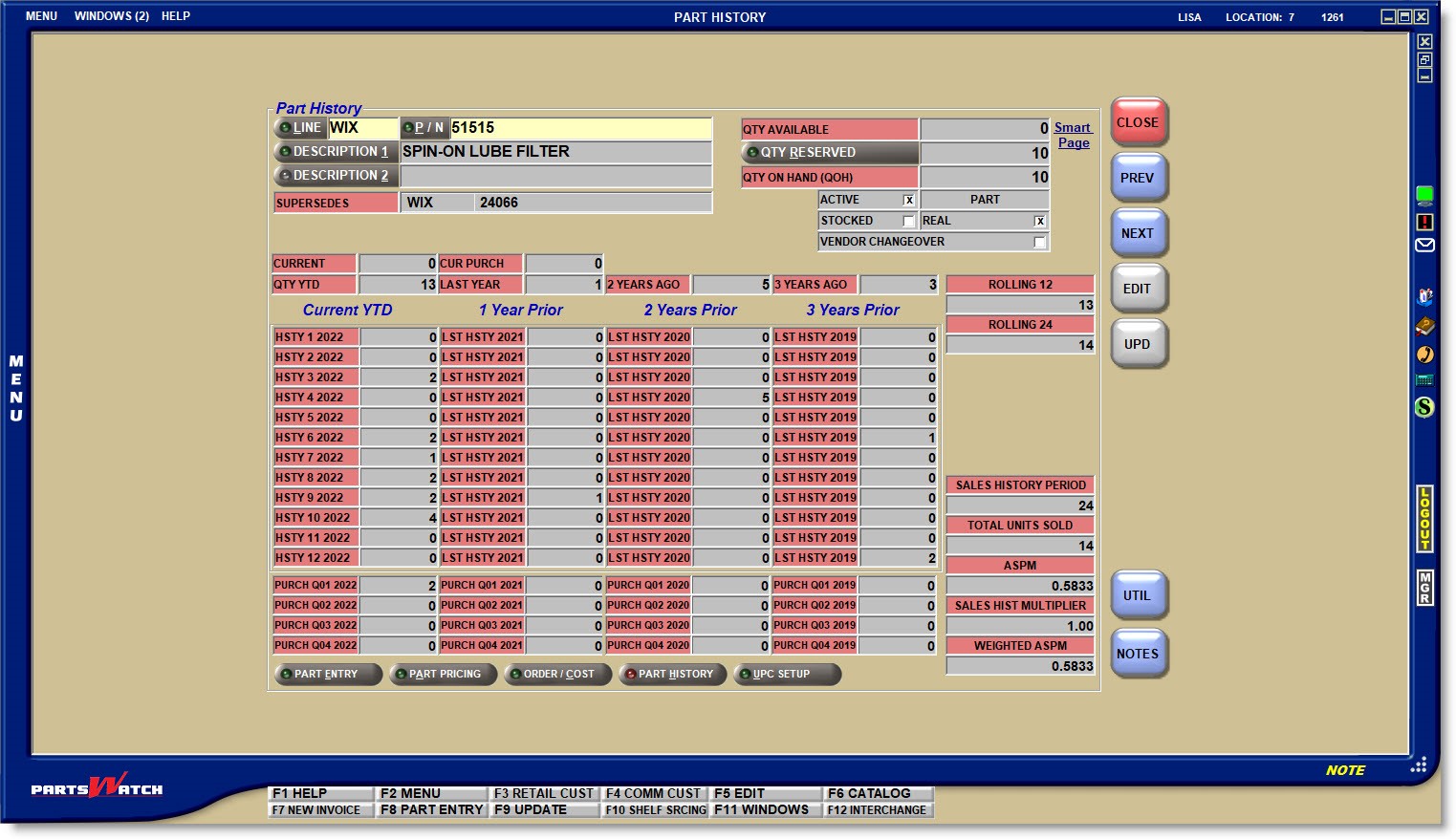 Depending on the 'AGE INVENTORY' setting on the SYSTEM CLOSE SCHEDULE screen, part histories are either aged 'MONTHLY' or 'QUARTERLY' and display the current year and the previous 3 years.