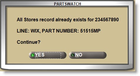 If the code being entered already exists under another part number for the current store or all stores, a pop-up opens to prevent duplicate codes for notification only.