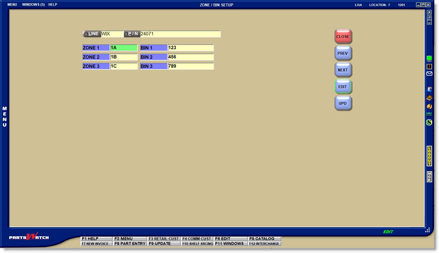 In addition to the primary 'ZONE' / 'BIN' set up per part, three additional ZONE/BIN setups can be added and maintained on the ZONE / BIN SETUP screen.