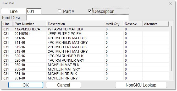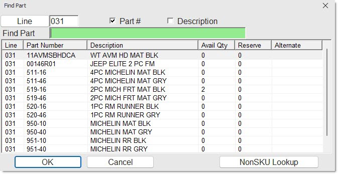 - If more than a single match is found, the Available Matches window opens with all Line Codes that contain the entered part number. Select the correct one to display that Line and Part Number.