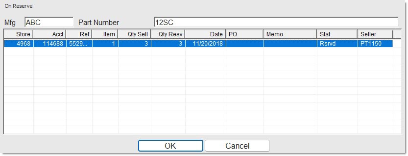 If the quantity is on reserve, click the 'QTY RESERVED' button to open the 'ON RESERVE' window with the accounts and sales order reference numbers that the part in focus is on.