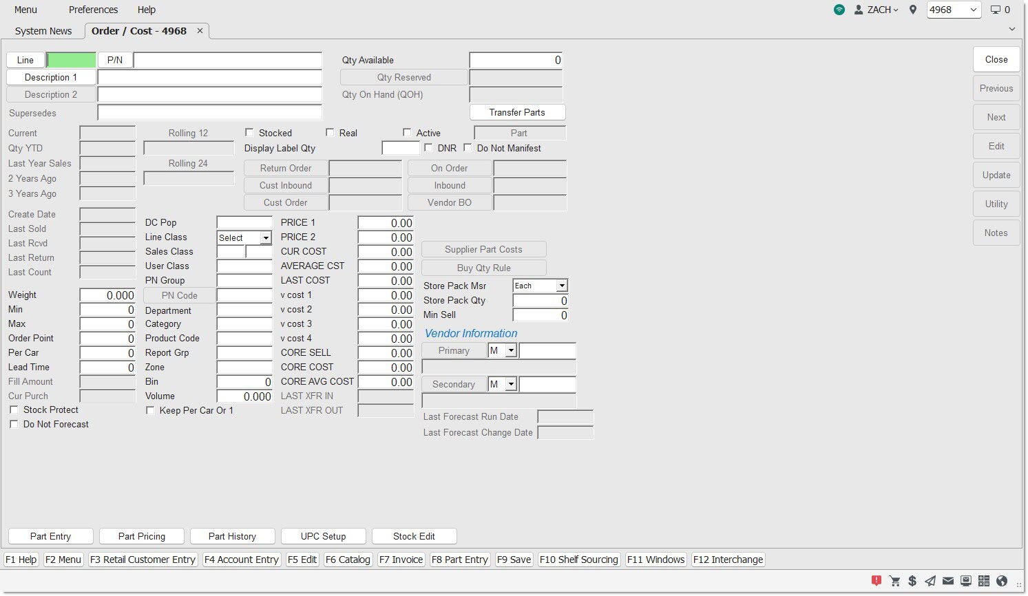 The ORDER - COST screen is used to add and maintain all inventoried part numbers by manufacturer Line Code that are used by the Invoicing, Purchasing, and Reporting modules.
