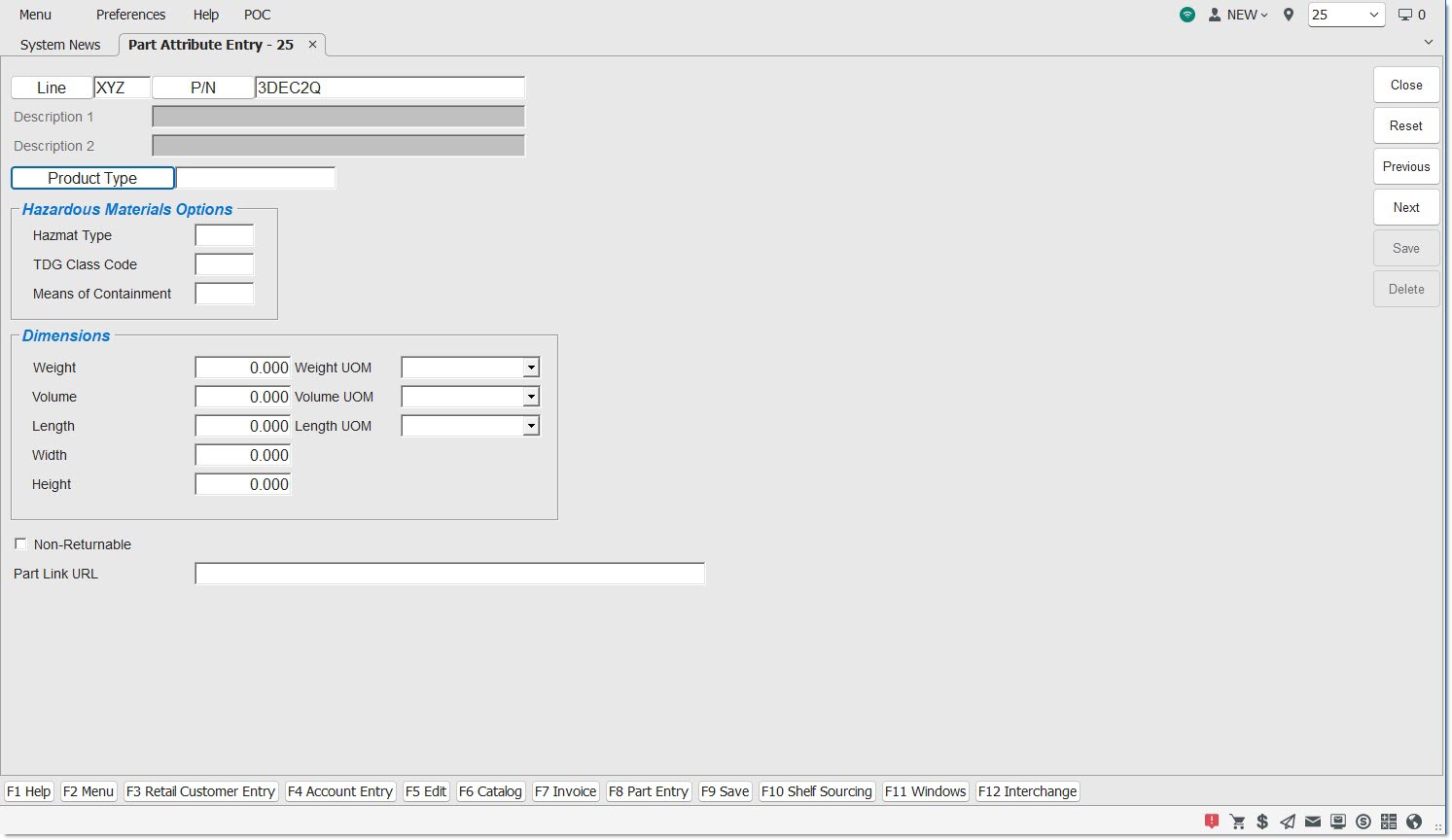 Menu Path: Inventory, Part Maintenance, Part Attributes Entry, PART ATTRIBUTES ENTRY screen