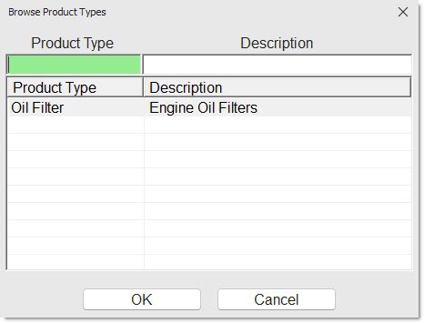 The 'Browse Product Types' pop-up opens with the product types set up in the SYSTEM GENERAL SETUP screen.