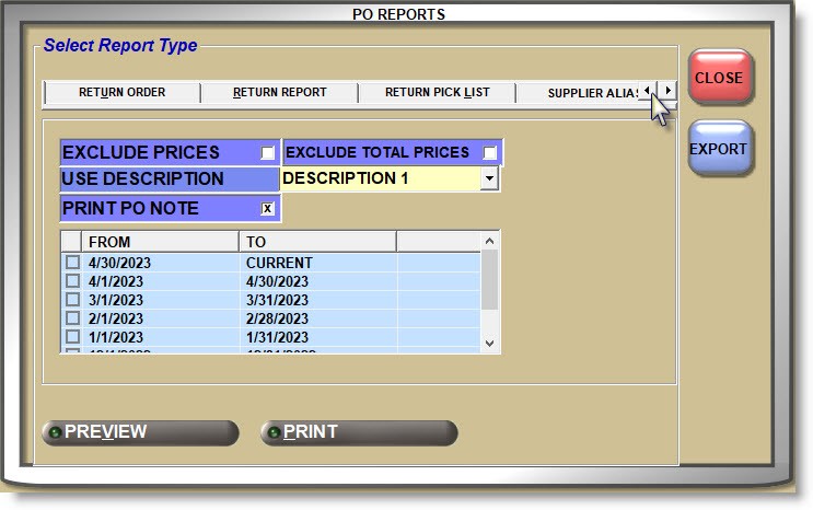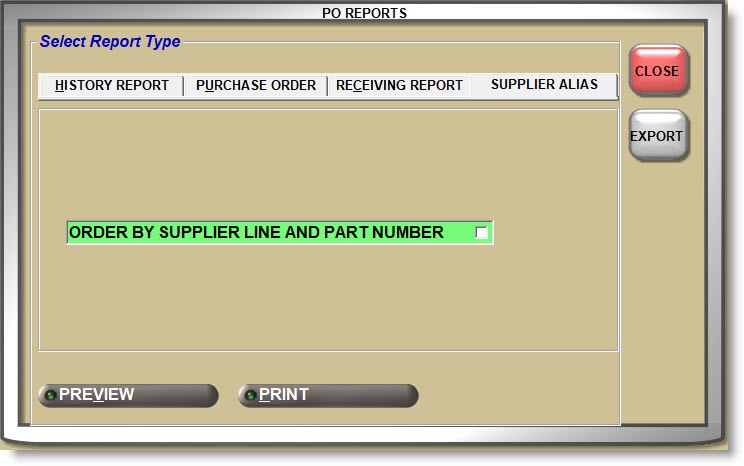 The 'SUPPLIER ALIAS' tab on the 'PO REPORTS' window allows purchase orders to be sent with the store's or the supplier's line codes and part numbers. Click the tab to display the control.