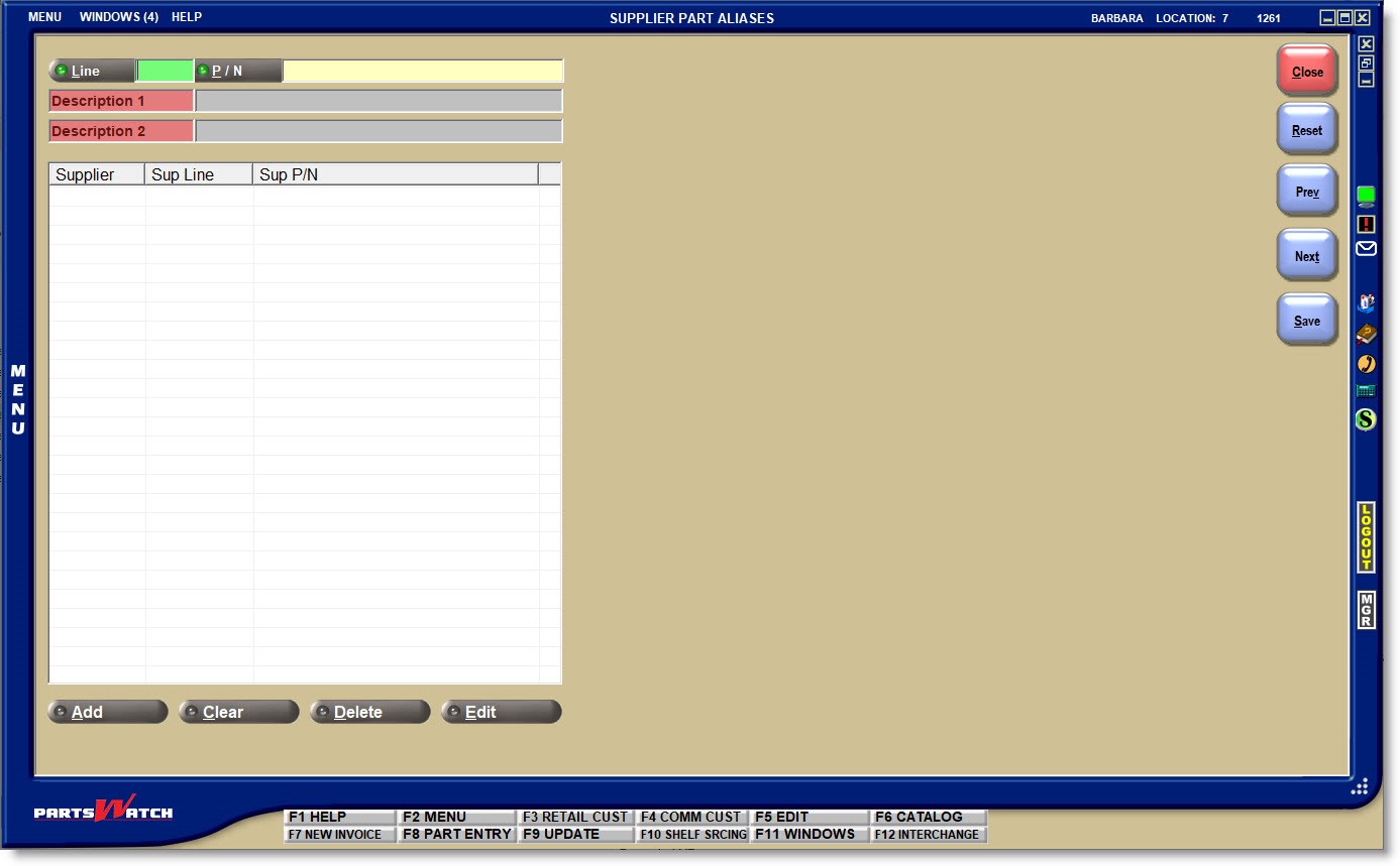 The SUPPLIER PART ALIAS screen is used to transmit different line and part numbers to vendor suppliers for the same line and part number maintained in the store. The store's parts can be mapped to different numbers that the vendor/supplier uses.