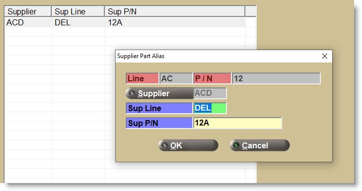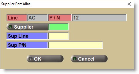 - Enter the line code used by the supplier in the 'Sup Line' field and the part number used by the Supplier in the 'Sup P/N' field and click the 'OK' button or press the 'Enter' key.