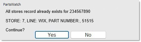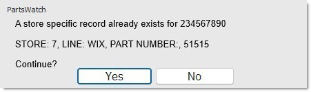 If the code being entered already exists under another part number for the current store or all stores, a pop-up opens to prevent duplicate codes for notification only.