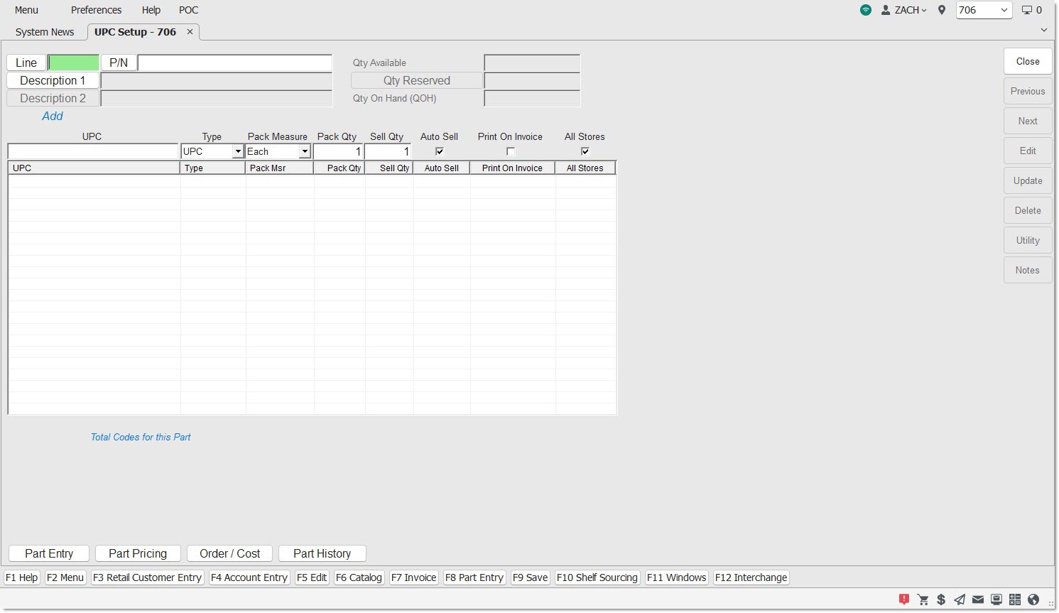 Menu Path: Inventory, Part Maintenance, UPC Setup, UPC Setup screen