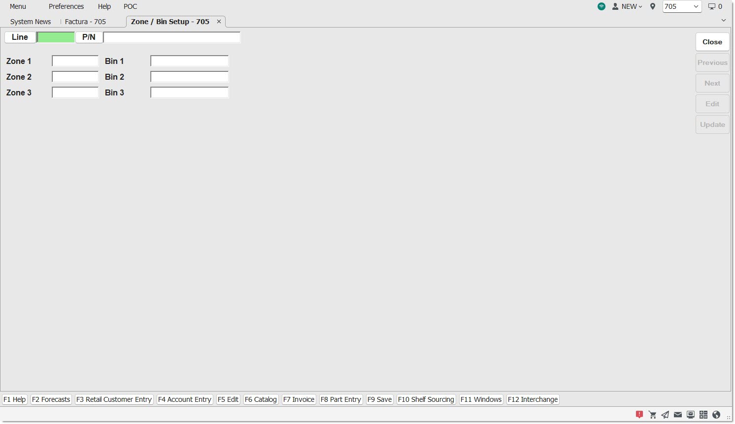 If a value exists in the 'ZONE' and/or 'BIN' fields on the Part Entry screen when the ZONE / BIN SETUP screen is added from the update, the system will copy the values to the respective 'ZONE 1'/'BIN 1' fields on the ZONE / BIN SETUP screen.