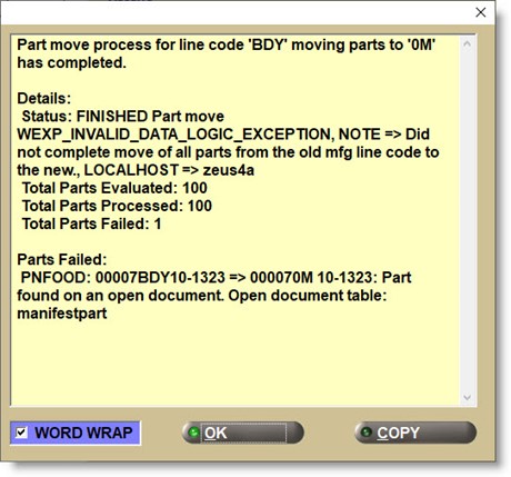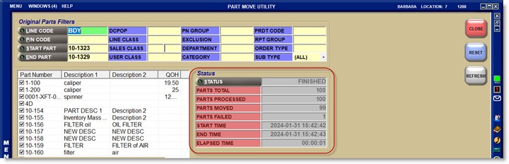 The status will change to 'FINISHED' when done. And, unless all selected parts are moved to the new line, the status will show as 'FAILED'. The utility can be rerun using the same old and new Line Codes if any parts fail.