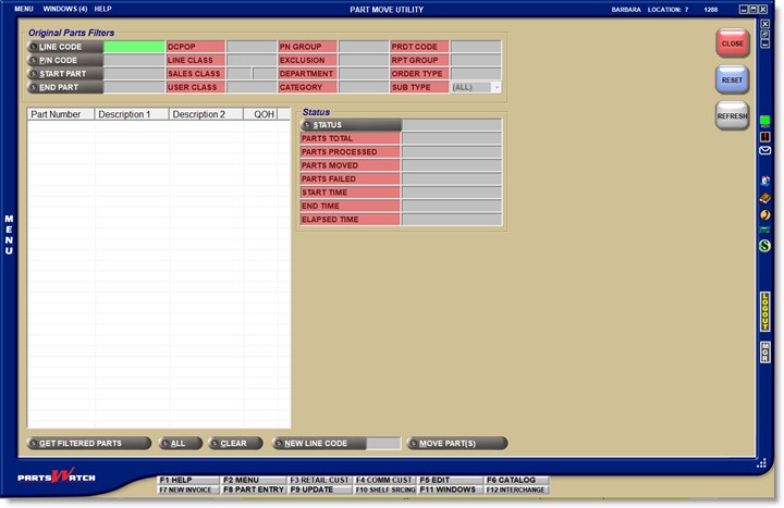 The PART MOVE UTILITY screen is used to change the Line Code on any or all parts within a line to match the Line Code used within the primary supplier's warehouse to simplify interfaces between the store and the warehouse.