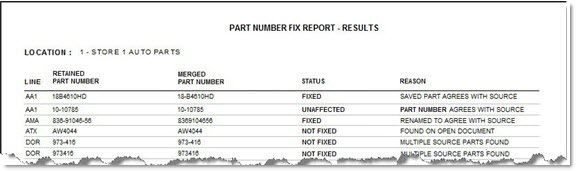 The following is an example of the 'Part Number Fix Report - Results':