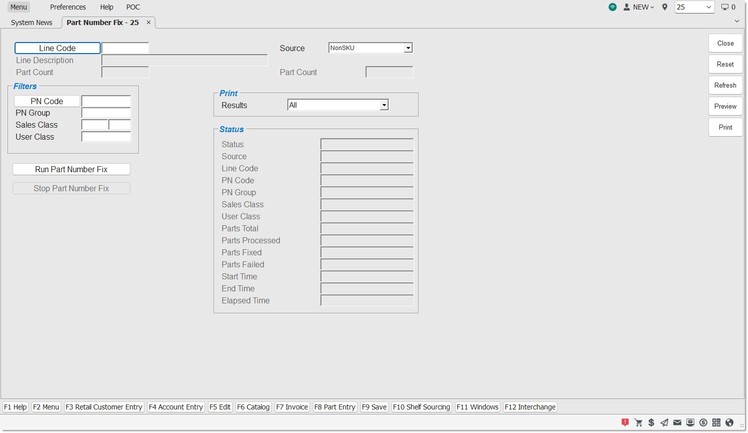 Find possible duplicates of the same part number in the store's part table by looking at the Pricing Server, part file or the nonsku table, depending on which is used, to verify the correct part. Only one line can be run at a time. Part Number Fix is store-specific and executes for all parts within user-defined selection criteria.