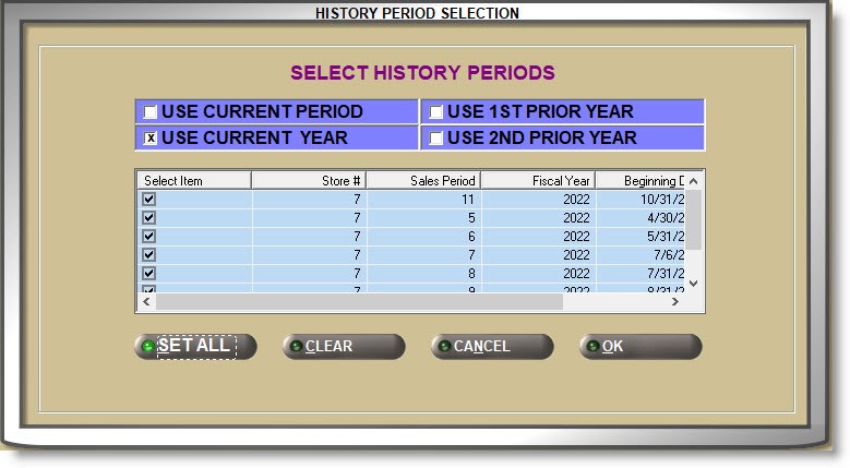 Click the 'SELECT PERIODS' button to display the 'HISTORY PERIOD SELECTION' window.