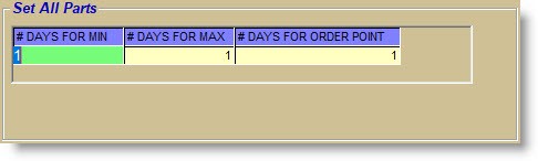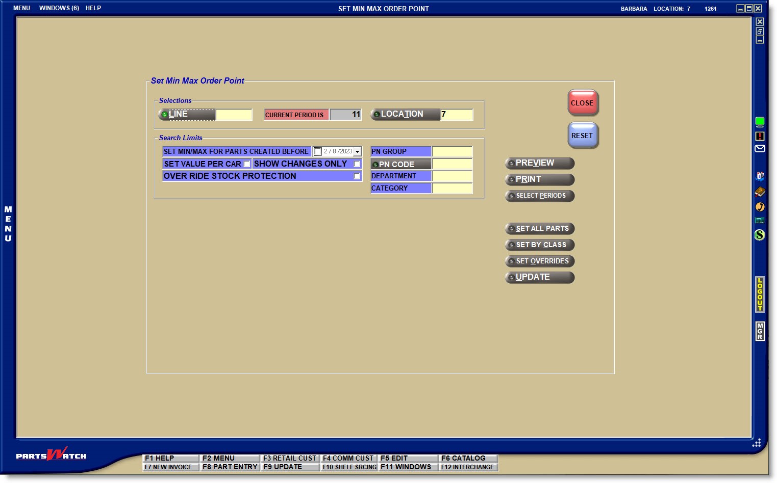 Menu Path: Inventory, Part Utility, Set Min / Max, SET MIN MAX ORDER POINT screen