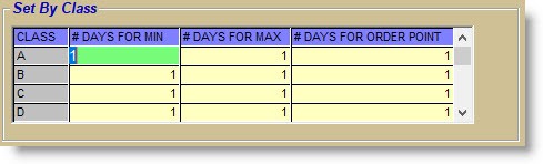 Click the 'SET BY CLASS' button to display the 'Set By Class' section below the 'Sales History Selection' section. The 'Set By Class' section is used to enter the number of days that the shelf quantities will last before being reordered per 'SALES CLASS' code.