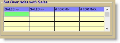 Click the 'SET OVERRIDES' button to display the 'Set Overrides with Sales' section below the 'Sales History Selection' section. The 'Set Overrides with Sales' section is used to enter the number of days that the shelf quantities will last before being reordered by using history values greater than and less than certain values.