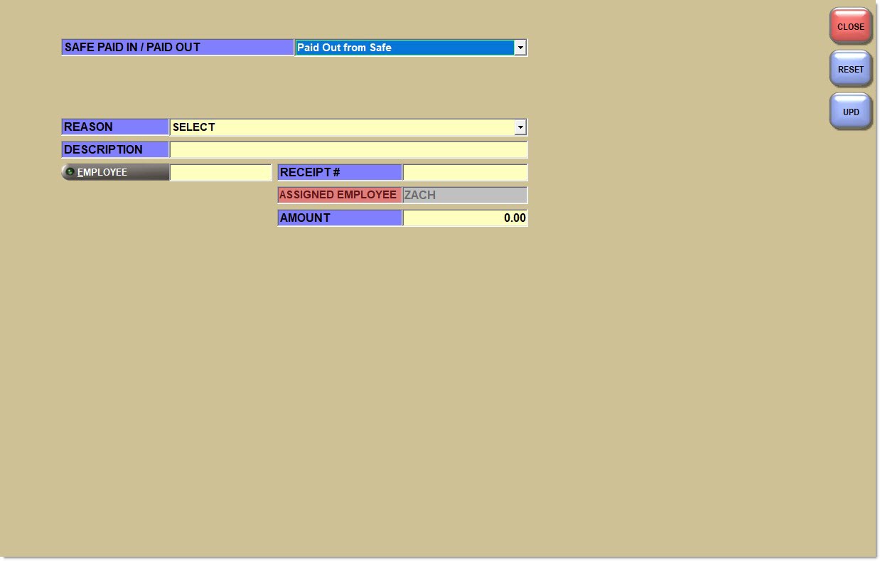 The Paid Out From Safe screen is used to create a paid out transaction from the safe. Paid Out transactions are tracked with the safe to be reported from the Day / Cash Close Report.