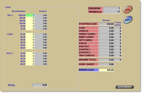 Reconciles the drawer. The drawer can only be reconciled once per shift. However, the drawer can be counted by denominations to obtain the drawer total at any time and as often as needed.