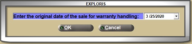 If the returned part has a warranty set up, but the returned part cannot be validated against the original sale (there is no receipt and the part cannot be found in purchase history), a prompt displays with the current date: